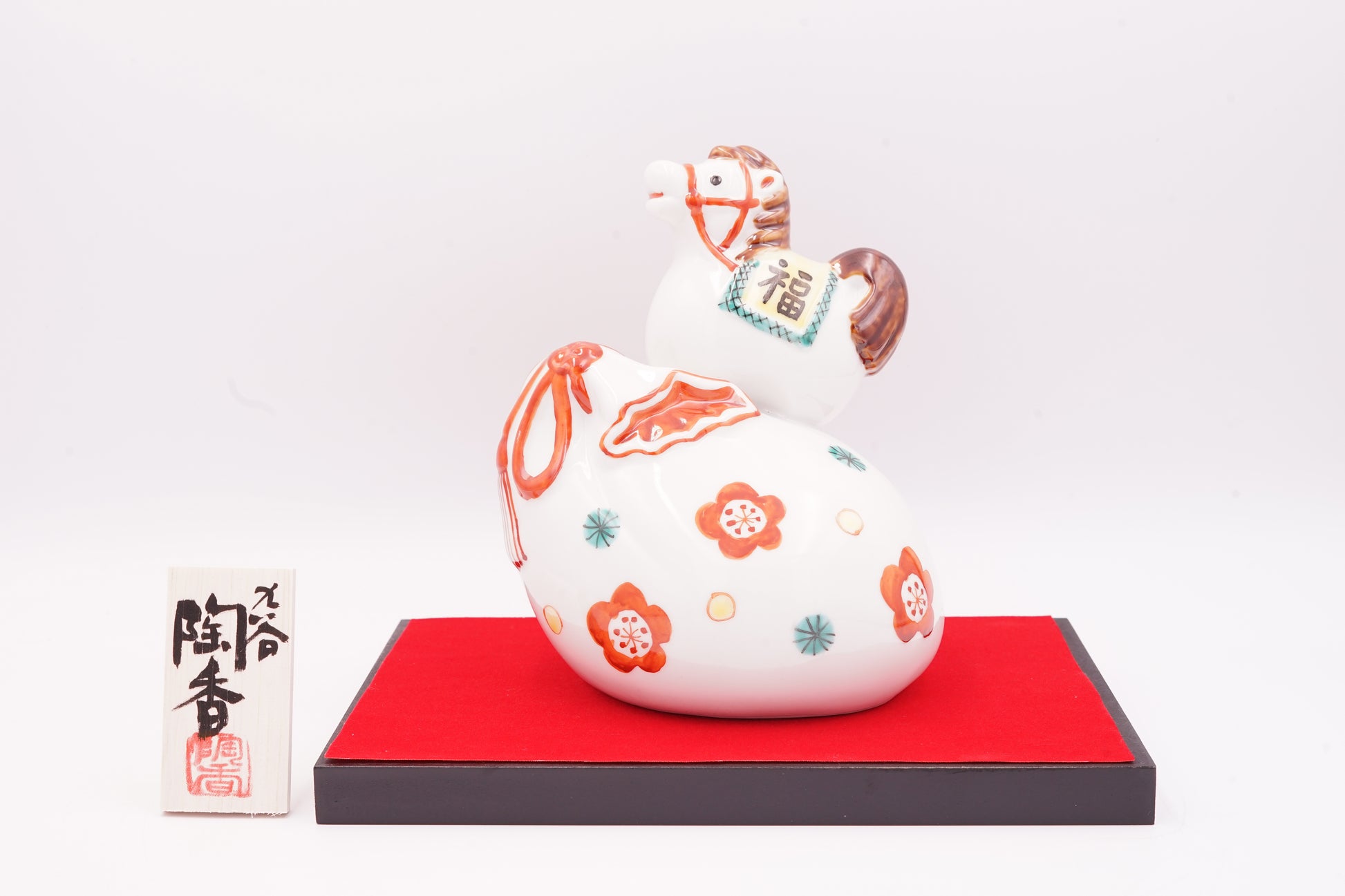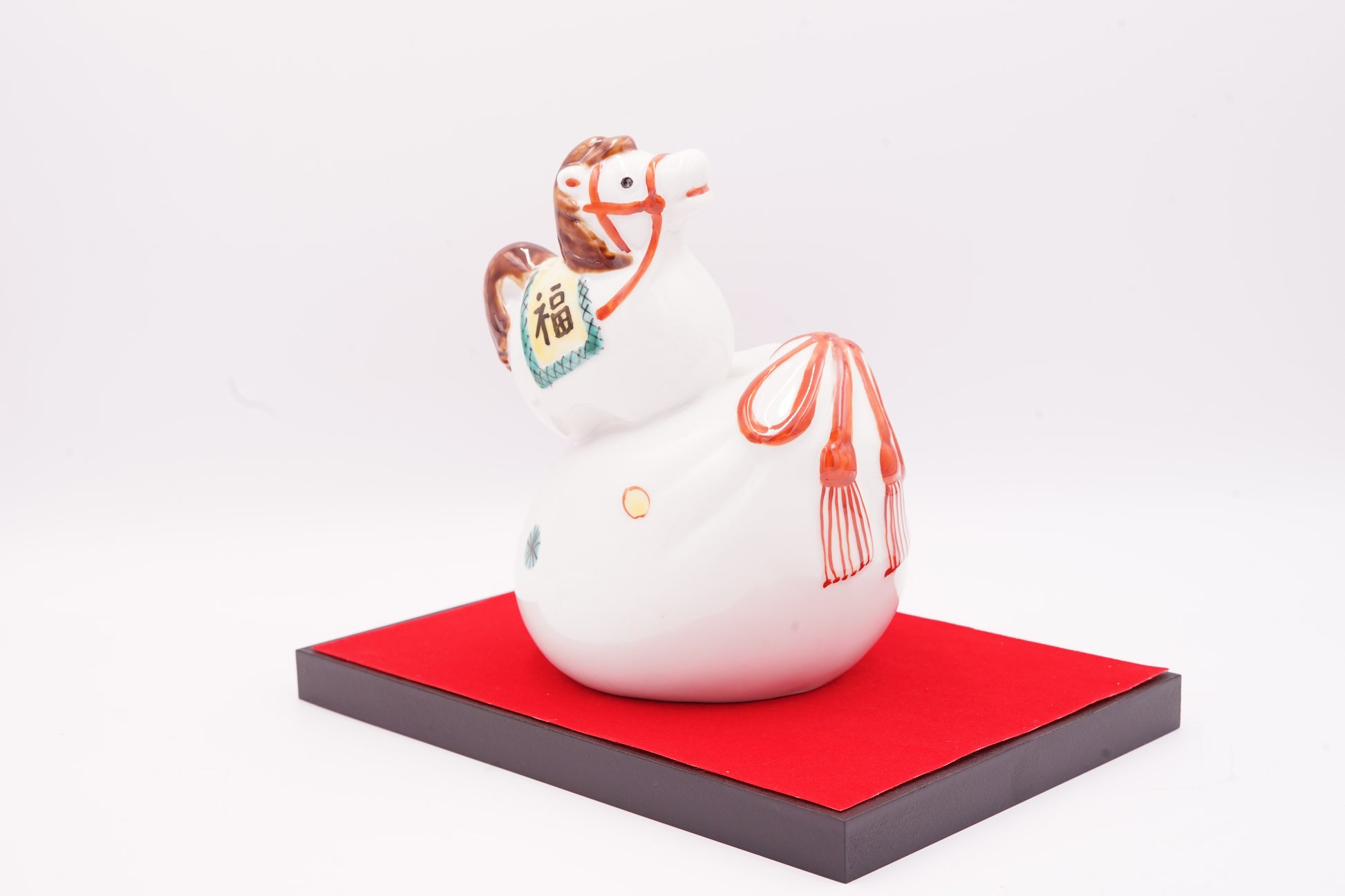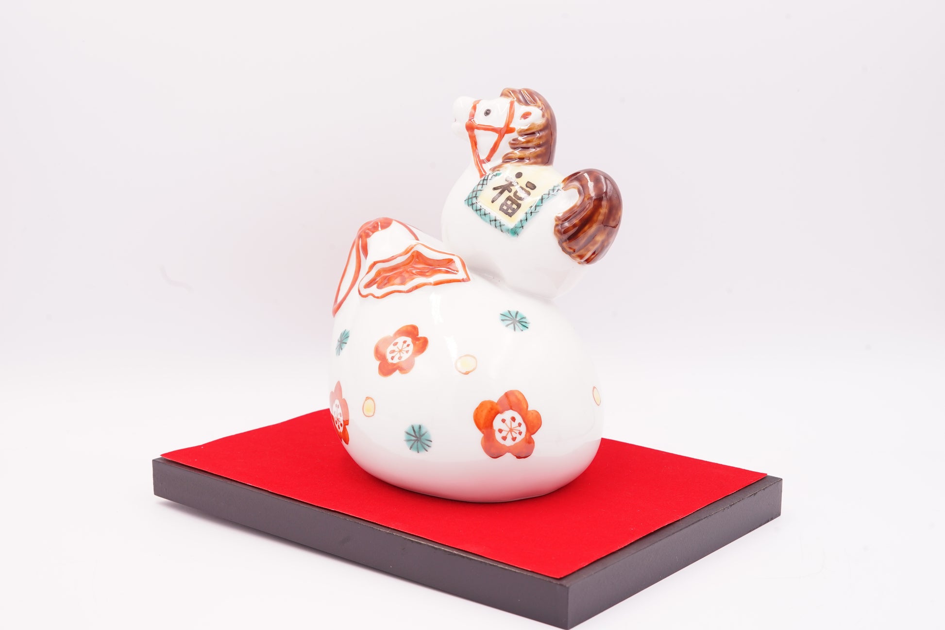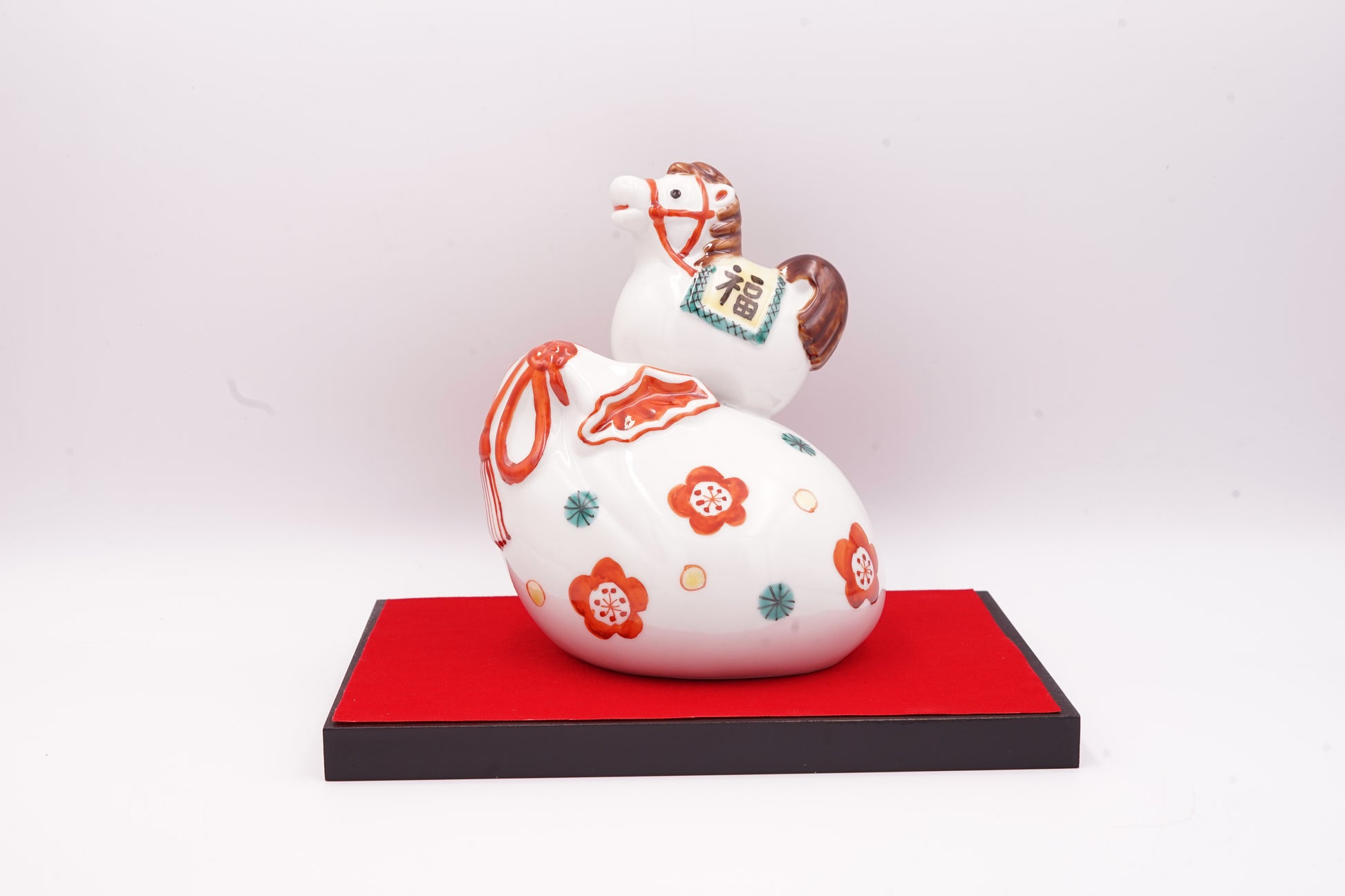 「宝袋」には花・松などの華やかなモチーフで、「馬」は福を背負い愛らしい表情で、小ぶりながら良い縁起を担いできてくれそうな仕上がりとなりました。米田陶香堂で1点1点手書きで絵付けされた一品です。