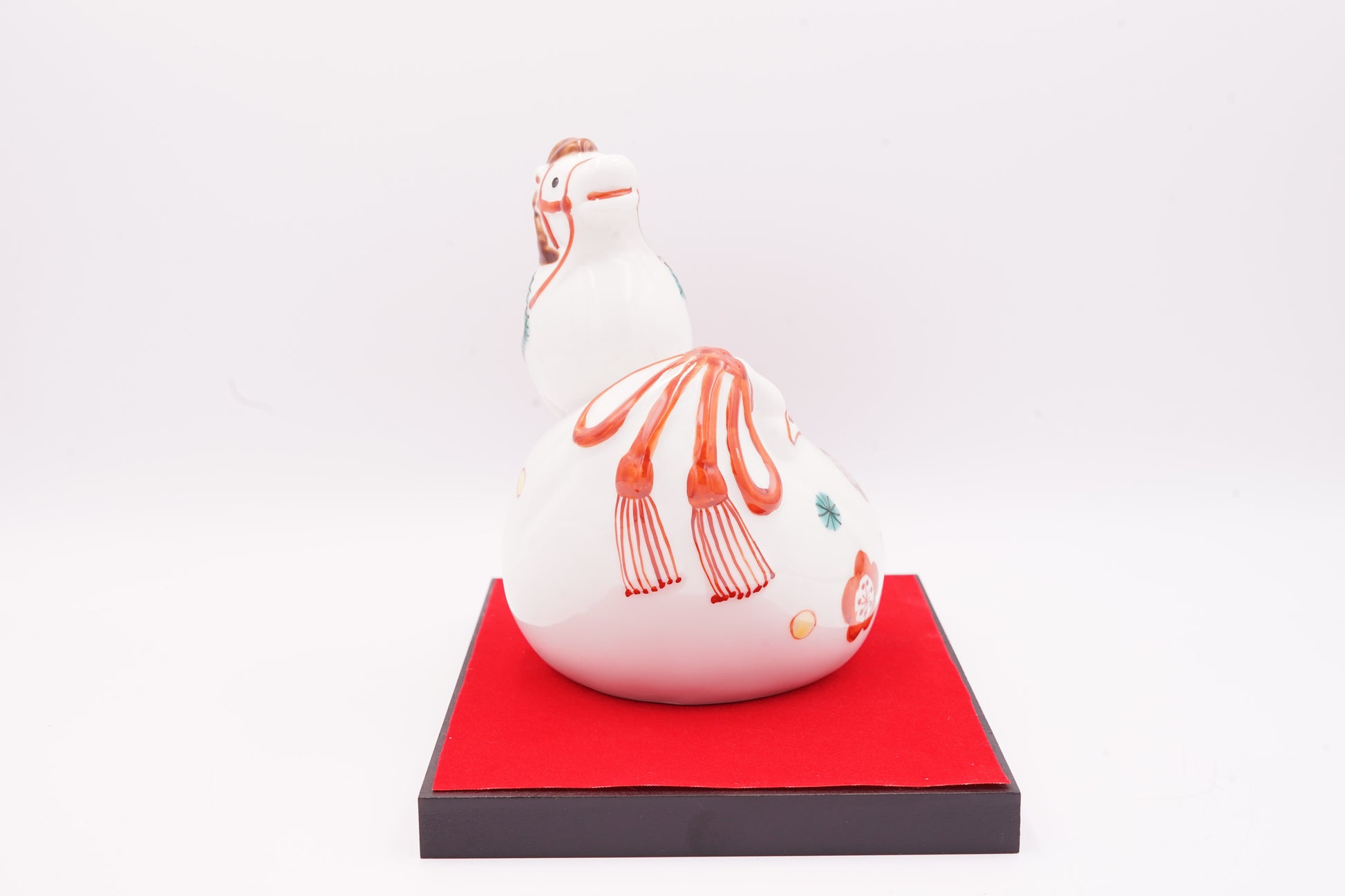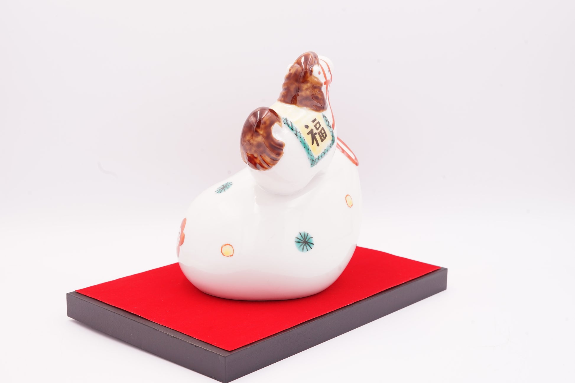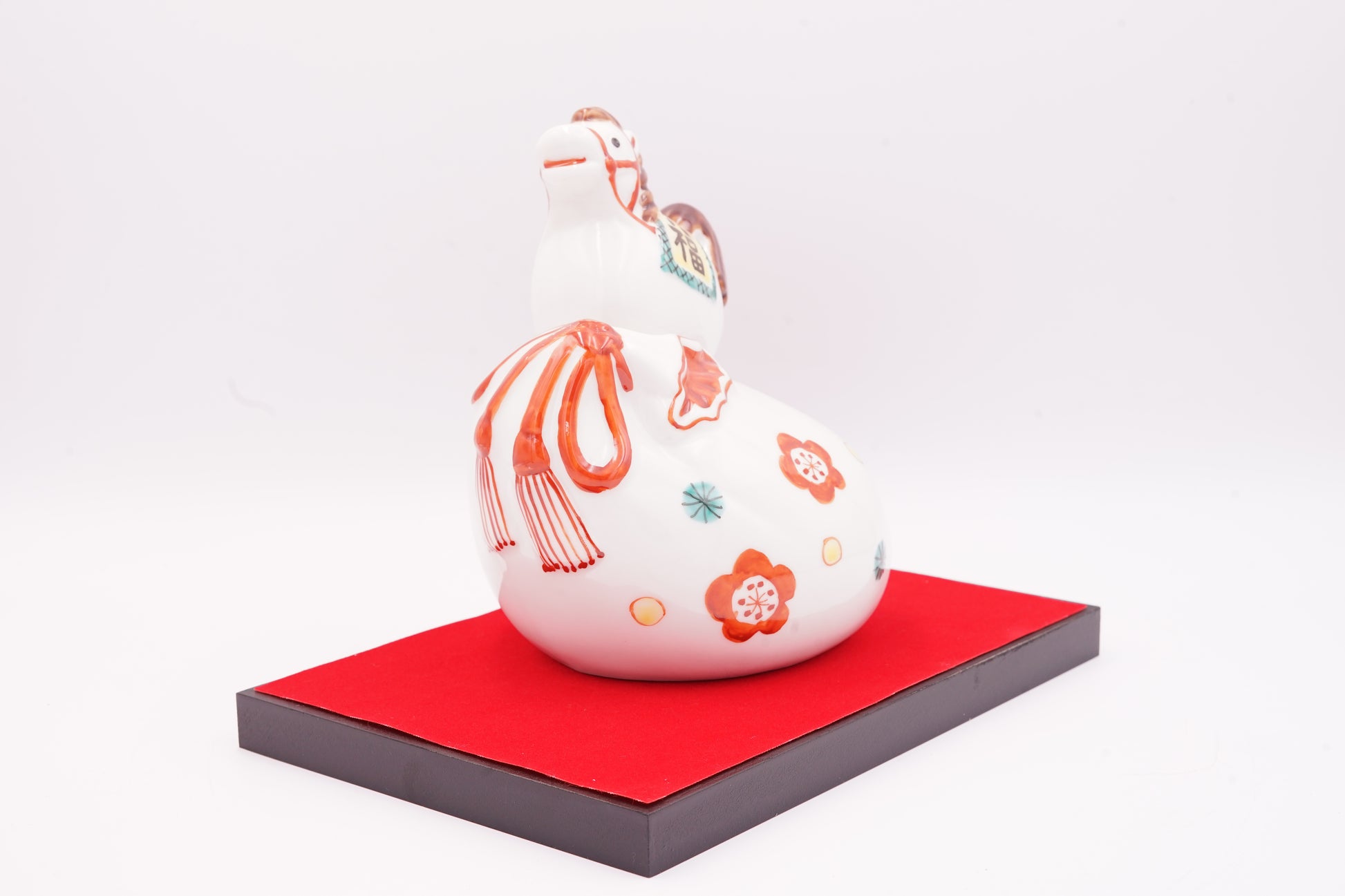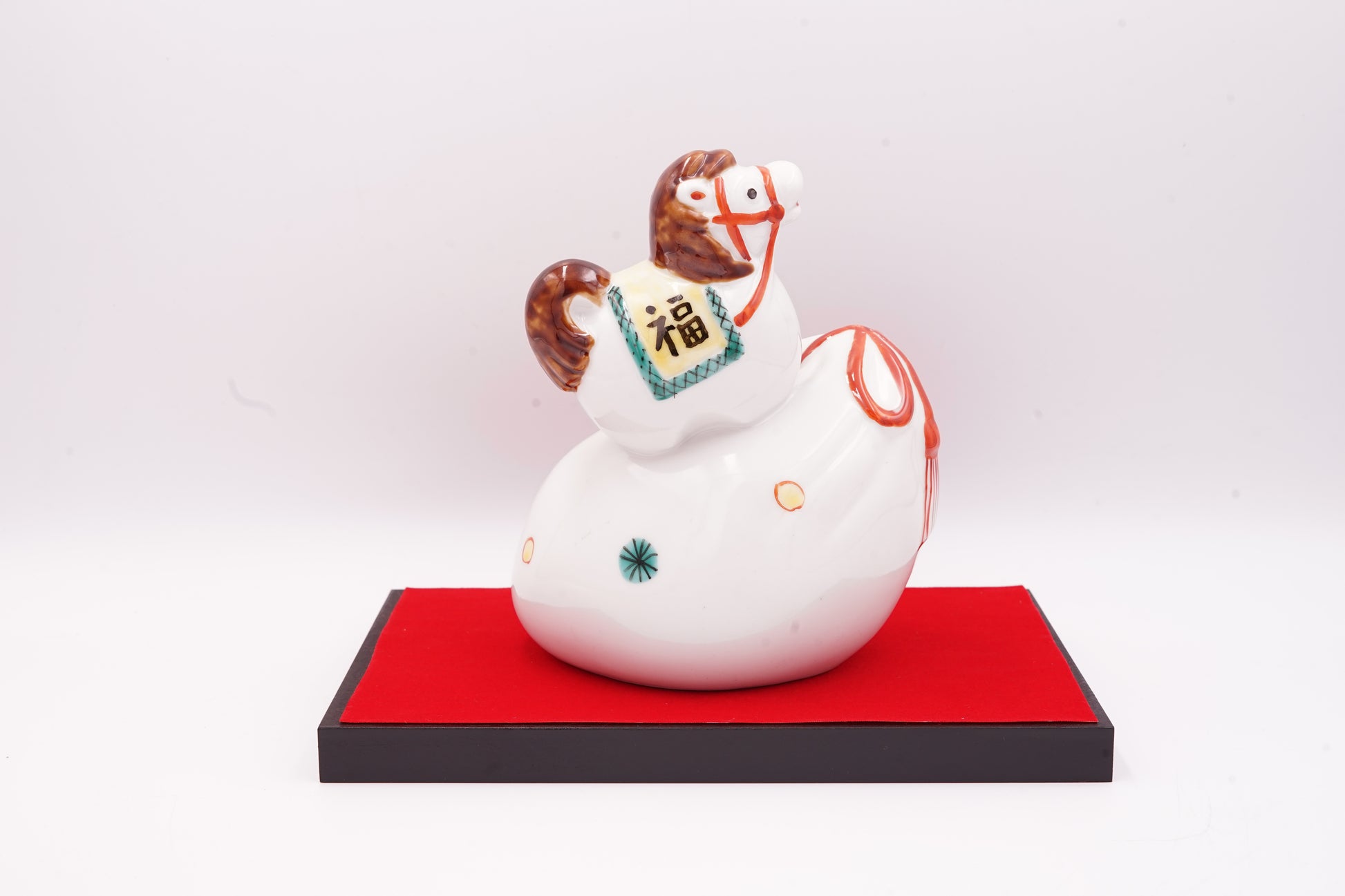 「宝袋」には花・松などの華やかなモチーフで、「馬」は福を背負い愛らしい表情で、小ぶりながら良い縁起を担いできてくれそうな仕上がりとなりました。米田陶香堂で1点1点手書きで絵付けされた一品です。
