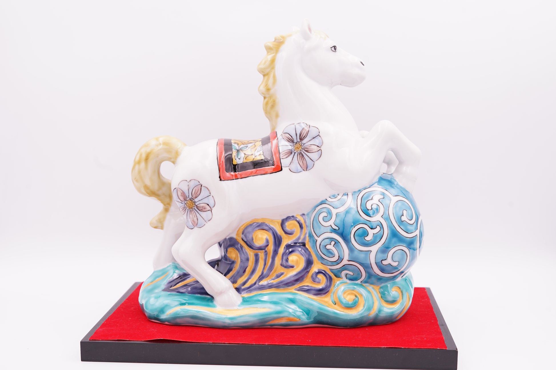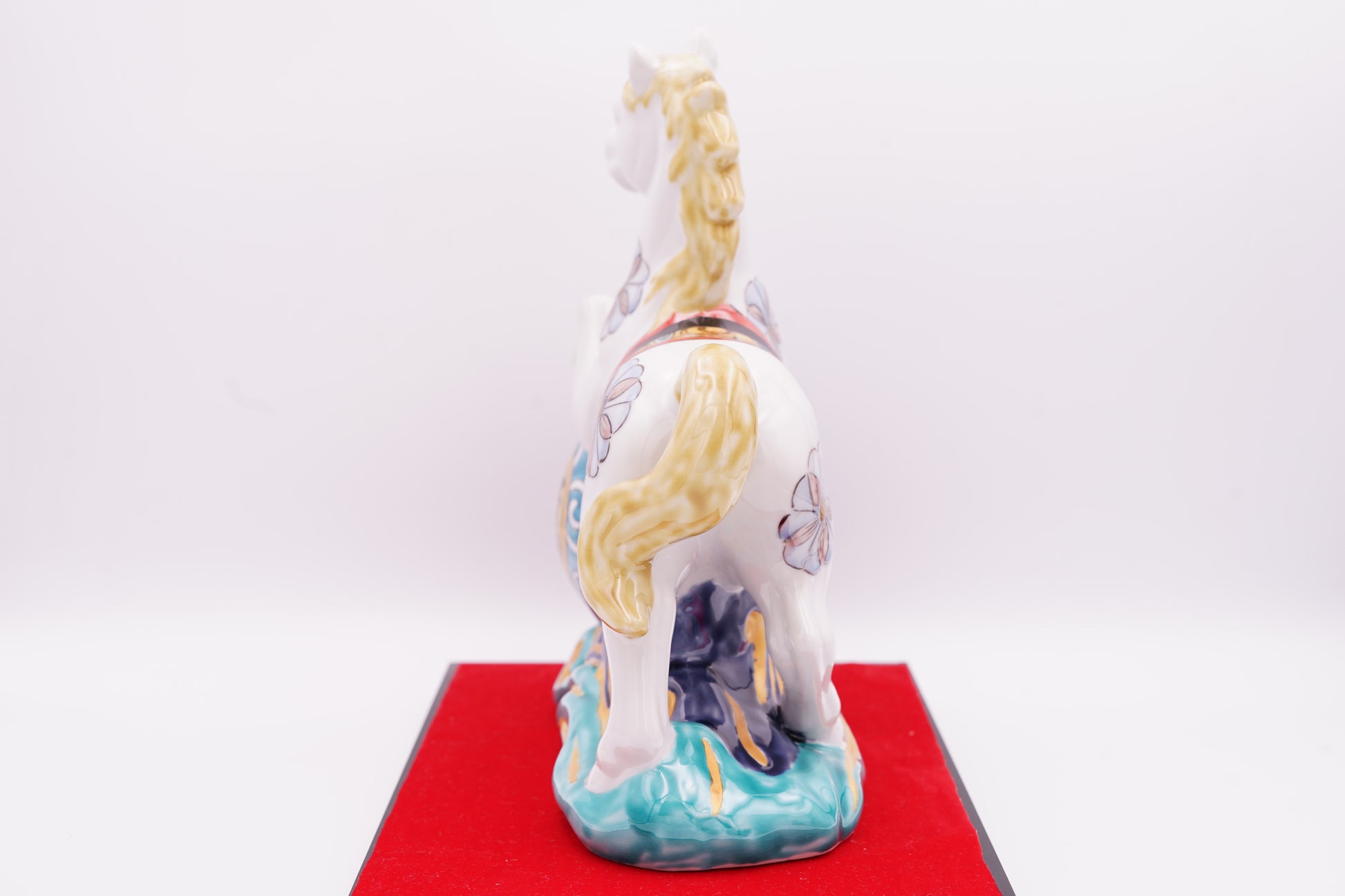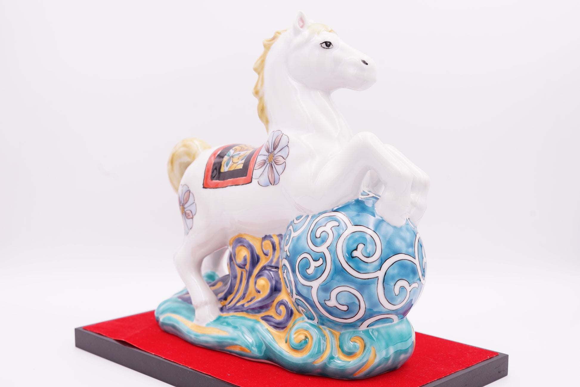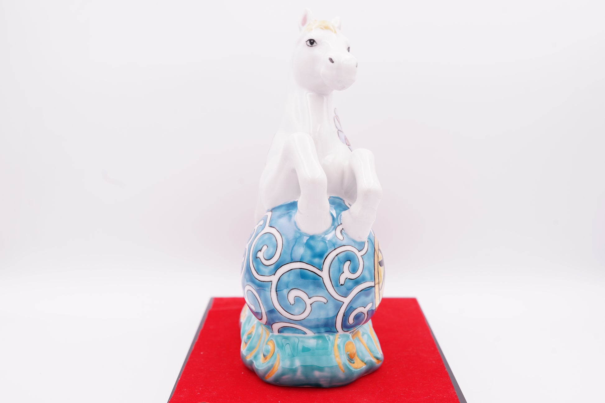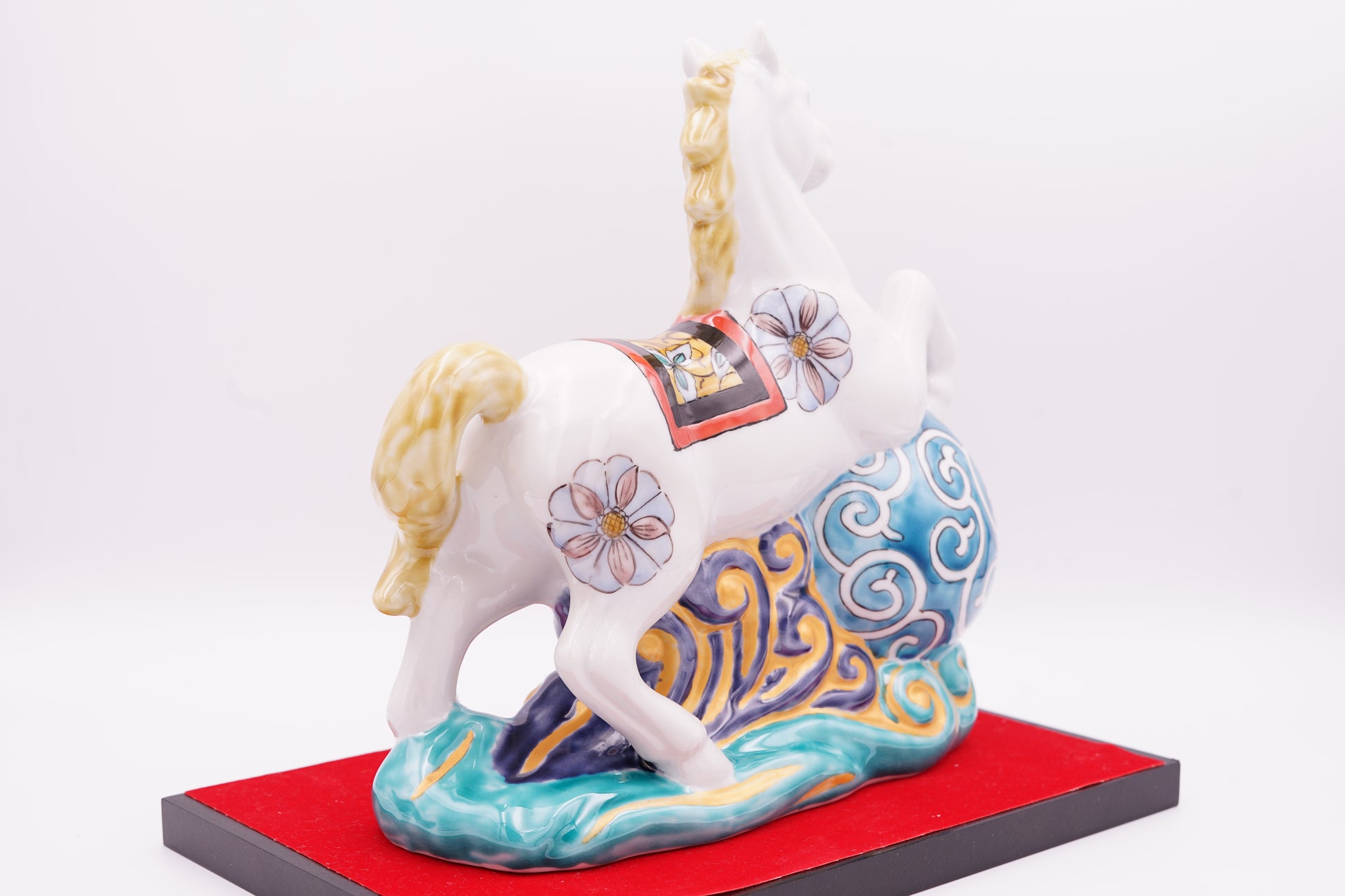 爽やかなブルーの波が勢いのある丁寧な絵付けが特徴です。唐草模様の中には「福」の文字を描き新年に相応しい縁起の良い仕上がりとなりました。馬のシックな立髪はモダンな雰囲気であり、気分で台を変えてみればインテリアに馴染む佇まいです。